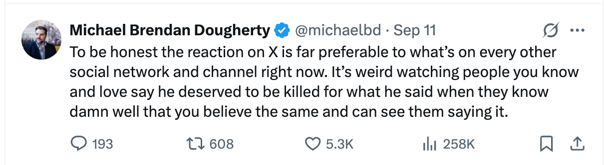 That, and this from Michael Brendan Dougherty, is why the Charlie Kirk assassination gets to me like nothing else, even though I wasn’t a particular follower of his (on account of being OLD, bro, and not very engaged in GOP politics):