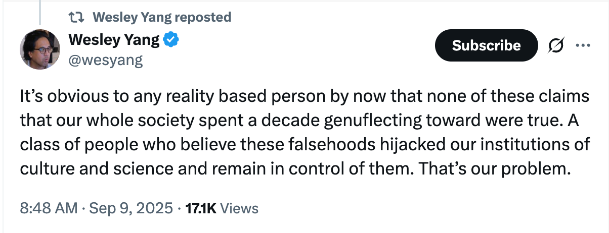 He was talking specifically about the entire BLM narrative, but he could easily have been talking about the trans narrative (his X account mostly focuses on this). David Betz said in his talk last night that the ruling class has “tricked, sedated, or bullied” entire populations into believing the multiculturalism narrative — of which (say I) BLM and trans were a part.