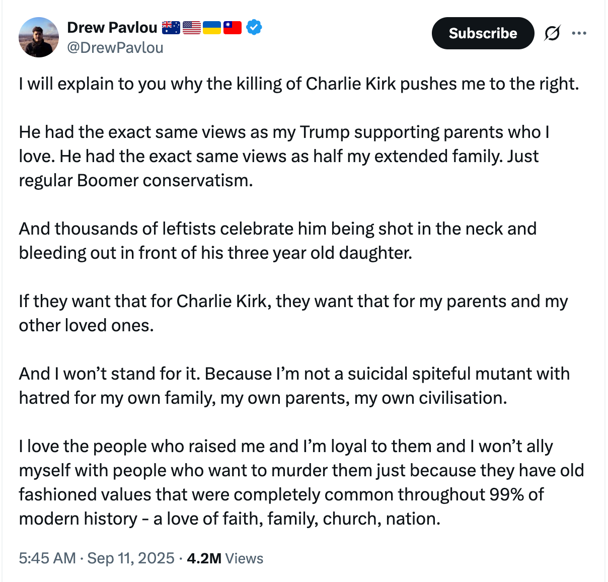 Charlie Kirk’s murder is a Rubicon. We now know — the evidence has been widespread on left-wing social media this week — that the USA is home to lots of people — including teachers, nurses, soldiers, and others in positions of responsibility —who are prepared to murder, or to support the murder, of people like us for the crime of believing in what Drew Pavlou quaintly termed “old-fashioned values.”