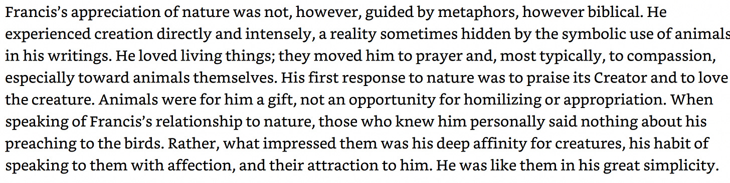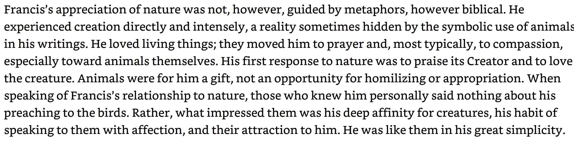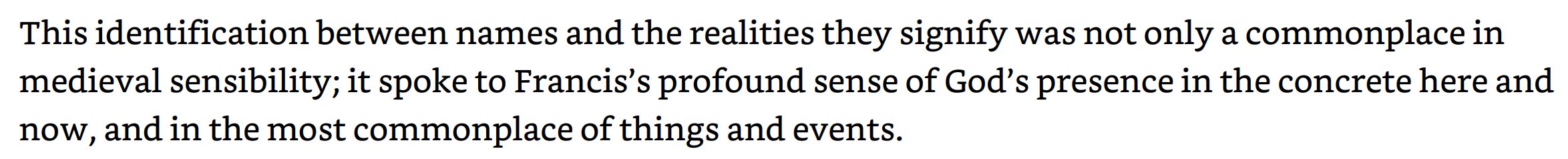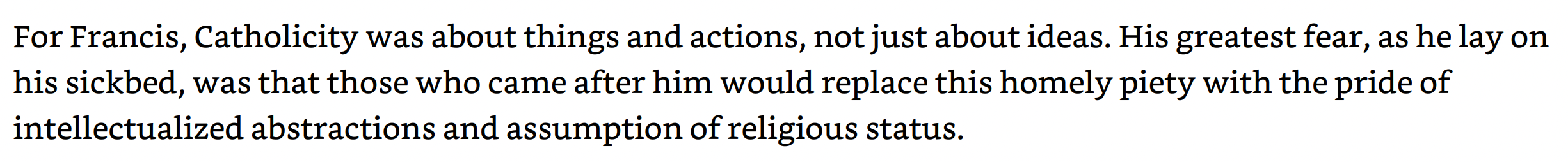 First, he taught me that loving God is something that remakes the soul, and doing good for others follows from this; it is not merely being good to others. Francis was more about being than doing. And the others whom the Christian serves are to be loved for themselves, no matter how unlovable, not because we can fix them by our good works. Second, rather than a call to accomplish any mission, program, or vision, a religious vocation is about changing one’s perception of God and creation.