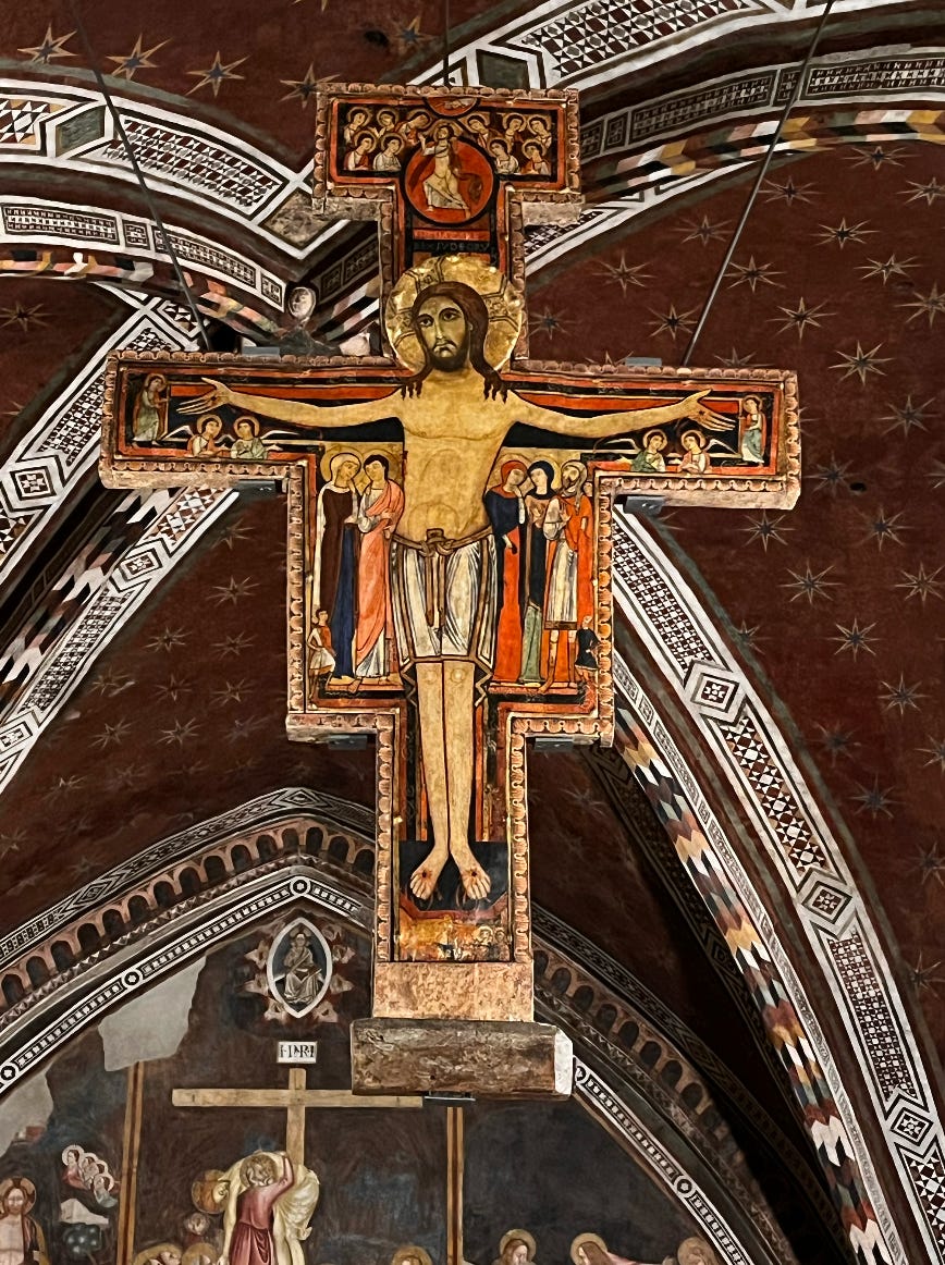Everybody, it seems, has seen a replica of the San Damiano Cross, the crucified Christ before which Giovanni di Pietro di Bernadone — known to the world as St. Francis of Assisi — was standing when he first felt the Lord’s call (in a mystical vision, in which this Christ spoke to him) to rebuild his church. Well, the one you see above — that’s the real one! It’s displayed in the Basilica of St. Clare, Francis’s first female follower, in Assisi. It originally hung in a ruined church about two miles from Assisi, the chapel of San Damiano.