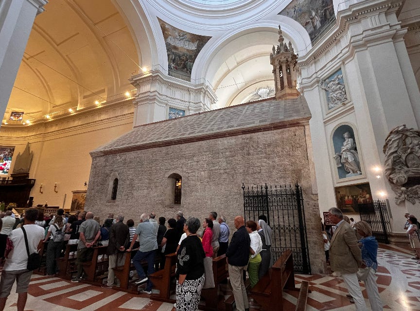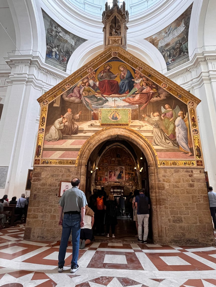 Francis interpreted Christ’s calling literally, and started begging alms to buy stones to repair that church, and others that had fallen into disrepair. One of them was the chapel of St. Mary of the Angels, also in the countryside near Assisi. That chapel became the first headquarters of the Franciscans. It is now inside the much larger church of St. Mary of the Angels. I prayed in it for about an hour on Sunday morning: