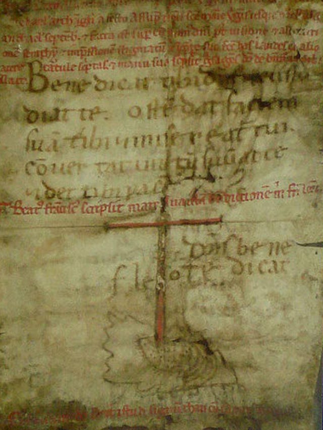 There’s another part of that basilica where some relics are kept. We know all about Francis’s poverty, but nothing hits you like seeing his actual brown tunic, made of extremely rough wool, and patched all over. It makes the plain brown habits worn by today’s Franciscans look luxurious. There is also there the famous letter he gave to Brother Leo, an early companios, on the mountain of La Verna, after he received the stigmata late in life. Francis wrote this blessing in parchment to Brother Leo, and told him to keep the document next to his heart all his life — which he did.