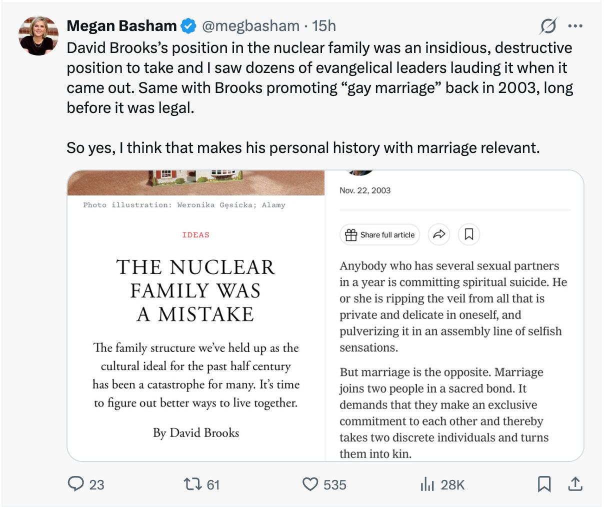 Brooks writes that the social and economic conditions that made the nuclear family, as idealized by Americans, disappeared long ago, and they aren’t coming back. But we can’t just sit back and do nothing. He ends the essay by talking about new ways people are trying to create the kind of networks that used to be natural in kinship. You may or may not like his proposals, but to say that he in any sense celebrates the demise of the nuclear family is false. Profoundly untrue. My guess is that a couple of paragraphs in which Brooks cites gays and lesbians rejected by their own families forming family-like networks of their own is what triggered Megan. But that’s one example of many. Most of them are more traditional, or at least not in conflict with Christian tradition.