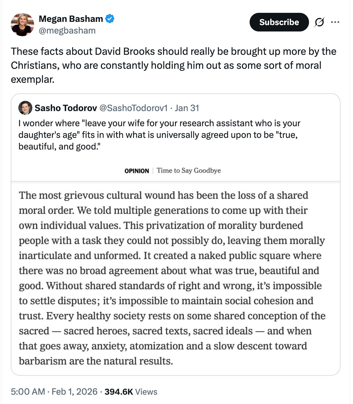 Look, lots of conservatives hate David Brooks. I get the sense from context here that there’s particular anger among some conservative Evangelical intellectuals, because both David and his wife are involved in Protestant anti-Trump intellectual networks. I don’t understand those dynamics, and as an outsider, wouldn’t presume to judge.