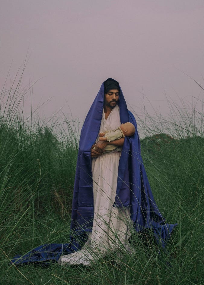 Notice the obscene spread-legged position of the Virgin Mary, and that Jesus is a junkie who has died of an overdose. The catalog says this image “interrogate[s] gender roles and stereotypes.” Sure it does.