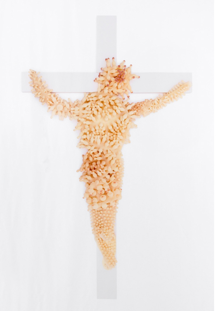 These are “latex nubs,” according to the catalog, but the head of Christ, at least, is unmistakably made of simulated maggots. The exhibition catalog says of this image and artist: