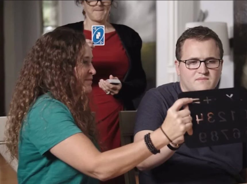 But also more than that. The family had to cope with evidence that he could read their minds, and the minds of others. For instance, they learn that he had “read” all the Harry Potter books, not because he literally read them, but because he experienced his sister Morgan reading them. There were practical problems with this. For example, Houston would beg his mom to cut off access to YouTube, because he felt compelled to watch videos and stim to them, as an addict (Houston calls this an addiction, because that stimulation gives him a high). But he kept figuring out how to break the passwords, until the family realized that he was reading it on their minds. Then they came up with a new way of using passwords that enabled them not to hold the passwords in their minds.