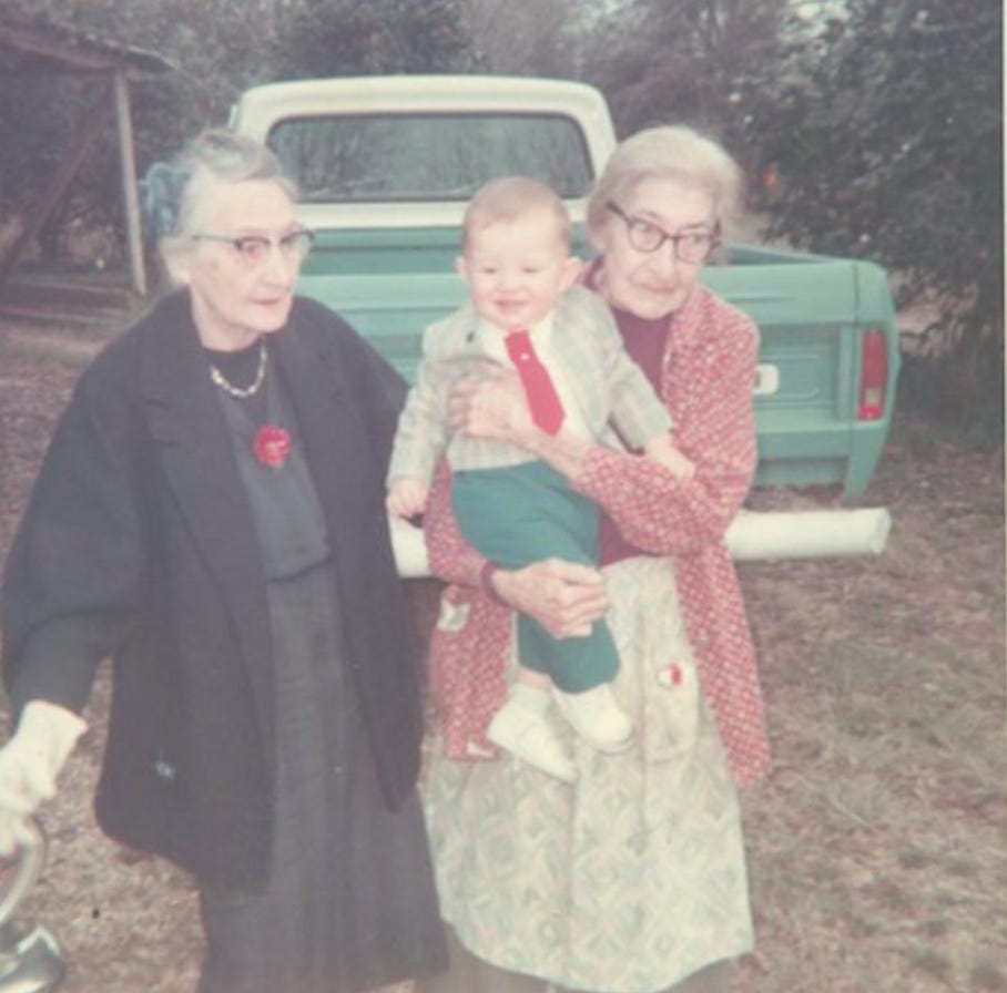 I wrote about this experience in a couple of posts on my old Beliefnet blog ages ago (see here and here), though I return to it periodically in this newsletter. Here I am in 1968 with them, outside the cabin. Aunt Hilda is on the left; Aunt Lois on the right: