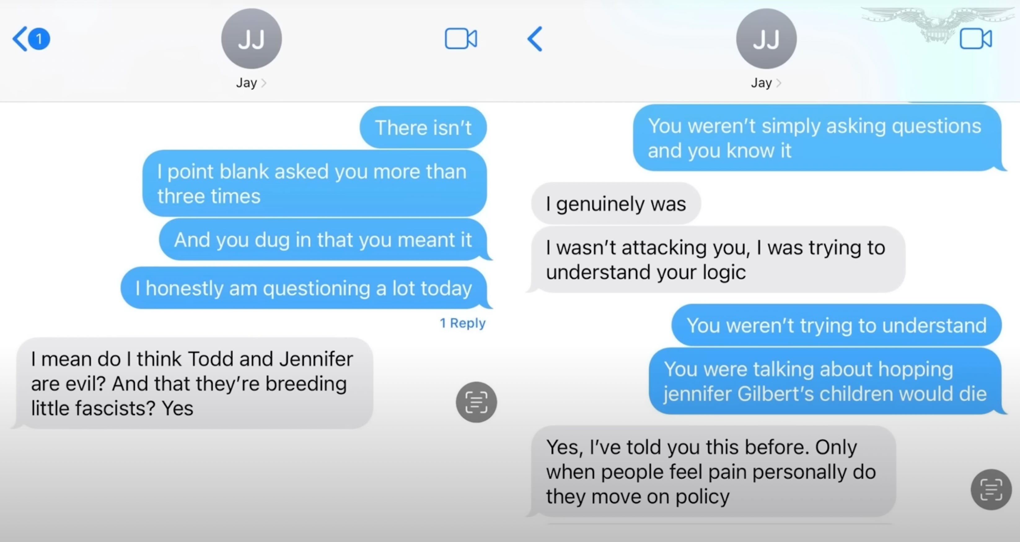 Afterward, Jones continued his barrage of text messages, saying he was just asking questions. Coyner dismissed his excuse via text and chastised Jones for “hopping [sic] Jennifer Gilbert’s children would die.”