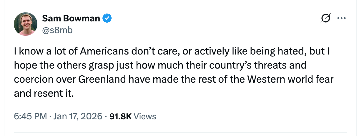 I’m also catching up on reaction to Donald Trump’s batshit attack on our European allies over Greenland, imposing tariffs, and promising greater tariffs, on European countries to force them to lean on Denmark to hand over Greenland. You need to read this long tweet from an X poster who warns Americans what destroying NATO, as a Trump move on Greenland would certainly do. Excerpt: